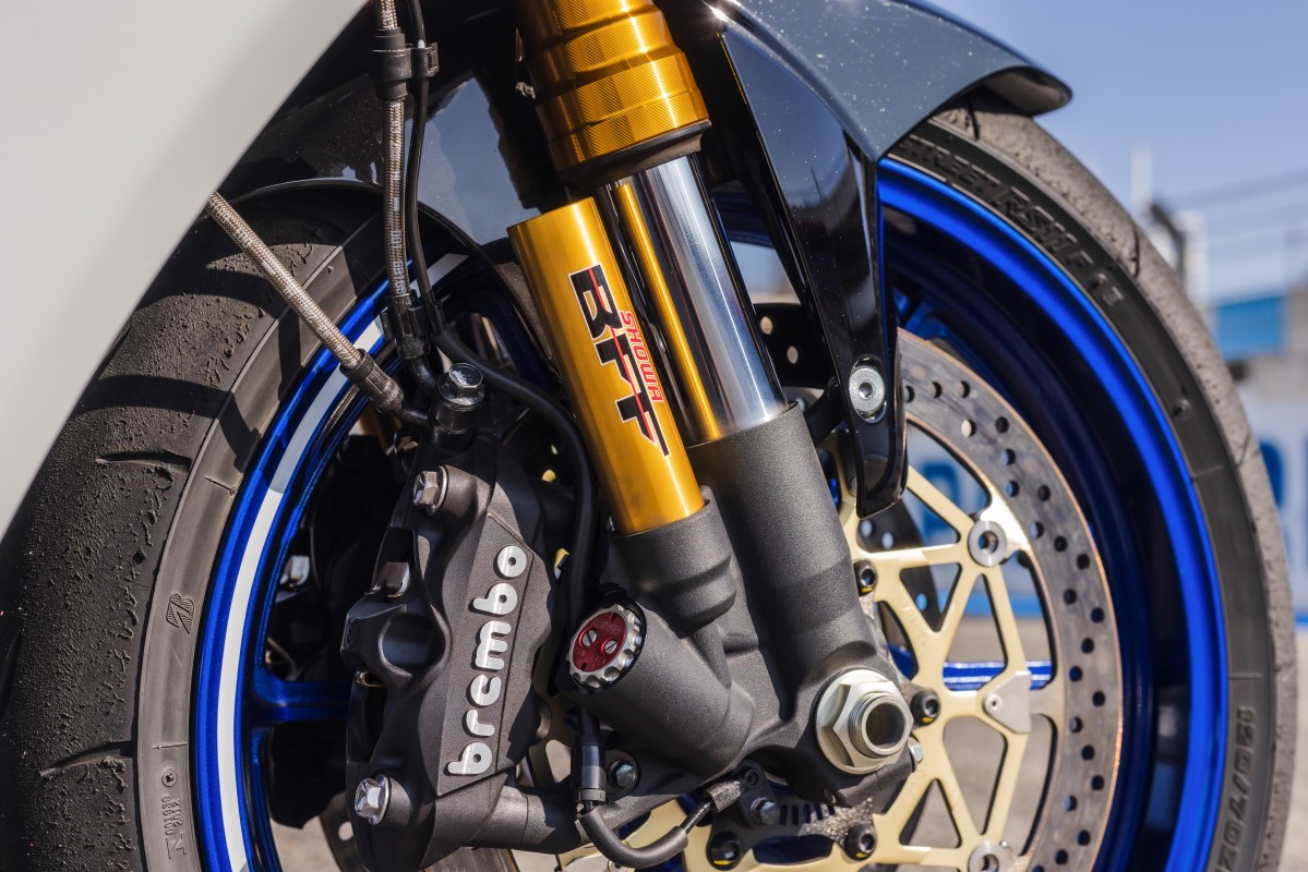 De 6-spaaks aluminium velgen worden geschoeid met de laatste generatie Bridgestone Battlax-RS11 banden. Voor in de maat 120/70ZR17M/C (58W) en achter in de maat 190/55ZR17M/C (75W). De Battlax-RS11 sportband is rechtstreeks afgeleid van de raceband van Bridgestone en aangepast en geoptimaliseerd voor sportief gebruik op de openbare weg. Daarnaast is de GSX-R1000R voorzien van een Brembo remsysteem met twee radiaal gemonteerde vier-zuiger (32mm diameter) remklauwen vóór in combinatie met twee 320mm remschijven. Achter wordt een enkele één-zuiger remklauw gemonteerd. Een elektronische stuurdemper met snelheid gerelateerde dempingskracht zorgt voor stuurprecisie bij lage snelheid en optimale balans bij hoge snelheid.